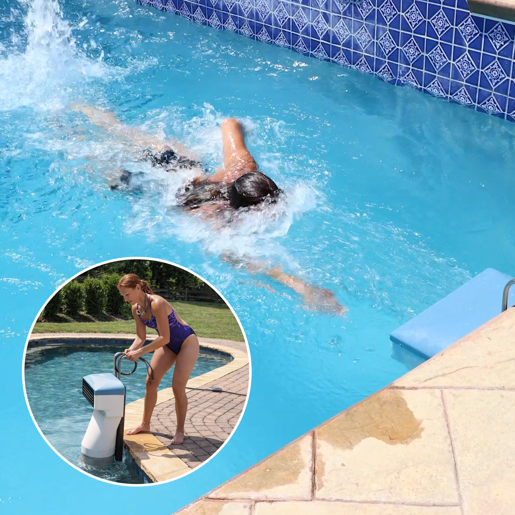 Slipstream Swim Machine: Just drop it in the pool and plug it into the power supply in under a minute to generate a wide, smooth but powerful current for swimming and more! We recommend a minimum of 35 inch depth and 11 feet minimum behind the unit of space to swim.