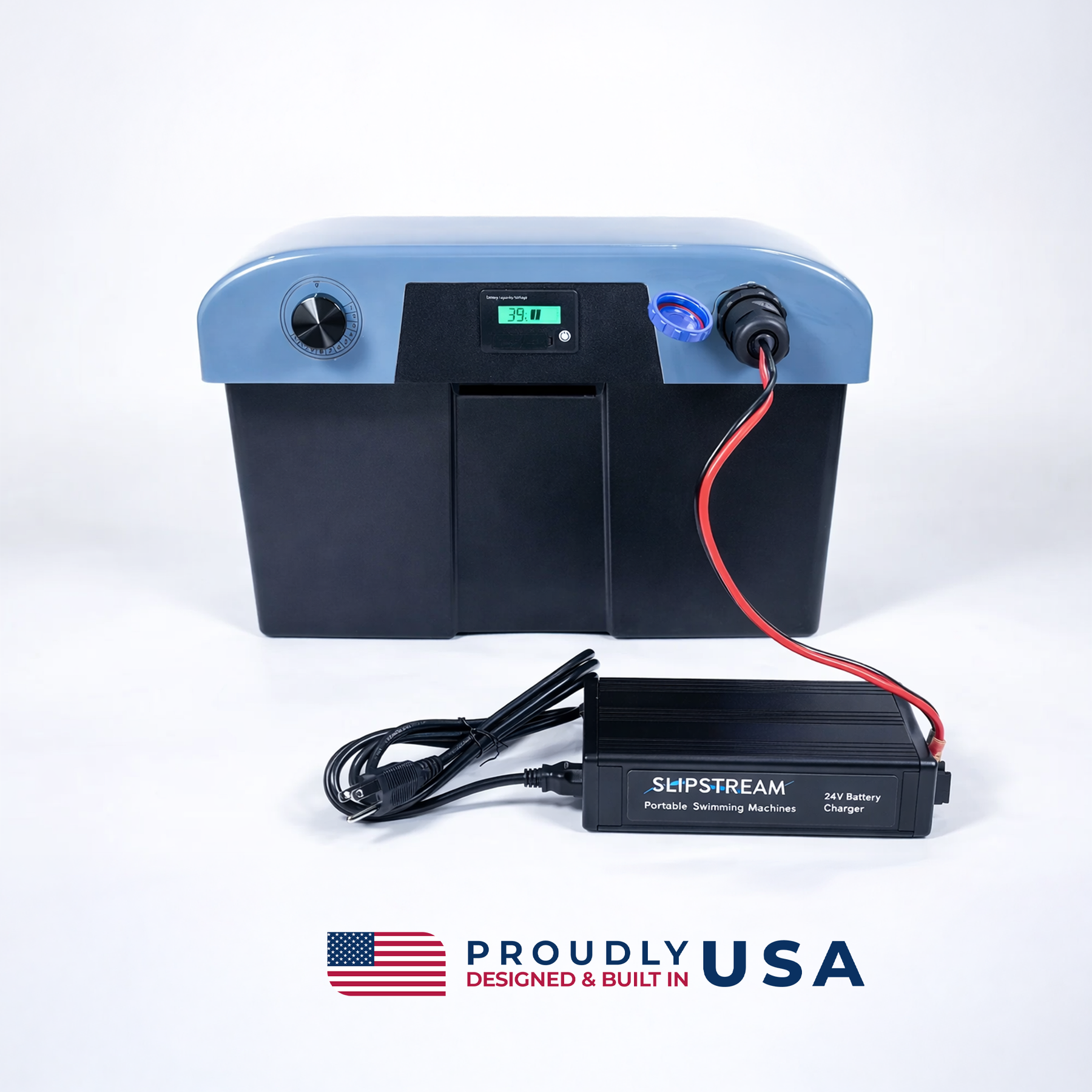 The powerful swimming current is engineered to deliver a smooth, wide & even current and is superior to swim jets and tethers. Slipstream comes complete with everything you need including our rechargeable power supply with swim current speed adjustment controls, 110V charger + charging cord, Lithium-Ion rechargeable marine battery, cover, and optional use swim snorkel kit and a cleaning screen that when attached will collect dirt and debris in your pool.